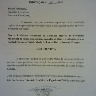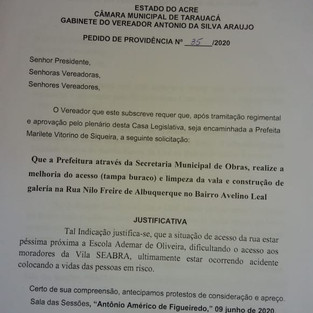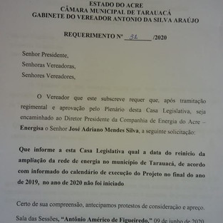 O vereador Antônio Araújo, apresentou suas reivindicações para aprovação dos colegas e posterior envio as entidades de direito, requerimento nº 31/2020 requerendo da Energisa a data de reinício dos serviços de ampliação da rede de energia em Tarauacá, previsto para final final de ano 2019 e até o momento não fora realizado; pedido de providência nº 35/2020 para que a secretaria municipal de obras realize melhorias do acesso (tapa buraco) e limpeza da vala e construção de galeria na rua Nilo Freire de Albuquerque no bairro Avelino Leal; e acesso e tape os buracos; pedido de providência nº 36/2020 que a secretaria municipal de obras realize aberturas, aterros e limpeza das ruas próximas a rodoviária Bairro Copacabana; pedido de providência nº 37/2020 para que a prefeitura regularize o abastecimento de carne no mercado municipal. Na indicação nº 25/2020 o parlamentar pede que a secretaria municipal de saúde disponibilize aparelho de raio x odontológico na UBS Maria da Luz no bairro Senador Pompeu. Ainda na área de saúde, o parlamentar defende que a prefeitura realize novas ações no combate ao mosquito da dengue, especialmente nesse momento de pandemia, e ainda disponibilize uma UBS Referência Covid-19 para realizar exames nas pessoas sintomáticas de dengue.